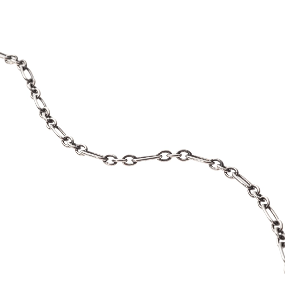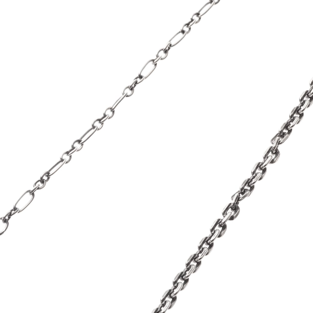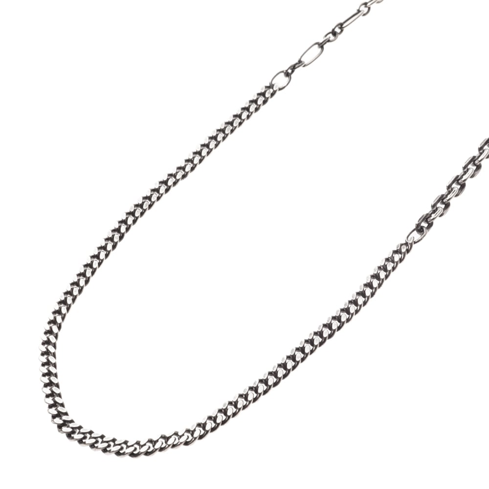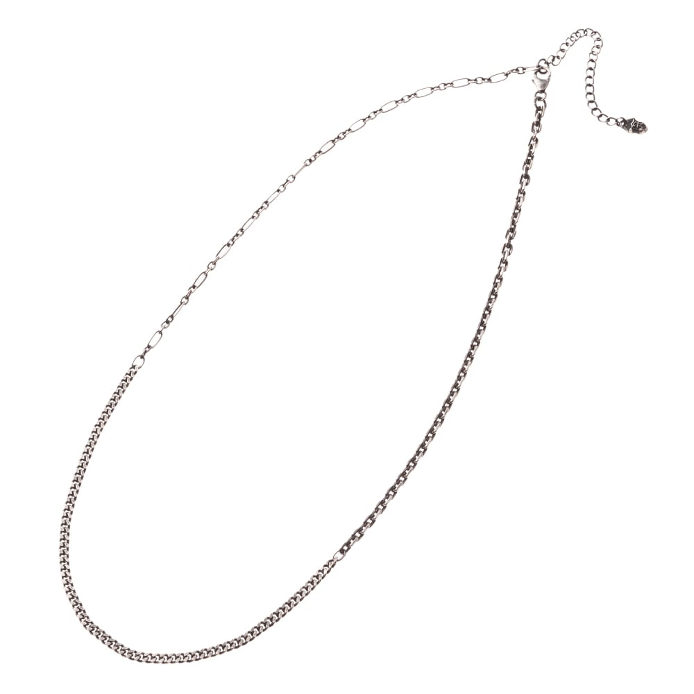 - ■三つの表情を一筋に。喜平・アズキ・オーバル&サークル、異なるリンクを精緻にブレンドしたミックスチェーンです。SV925に燻しを効かせ、磨き上げた面がさりげなく光を拾う――奥行きのある艶が首元のラインをすっきりと描きます。