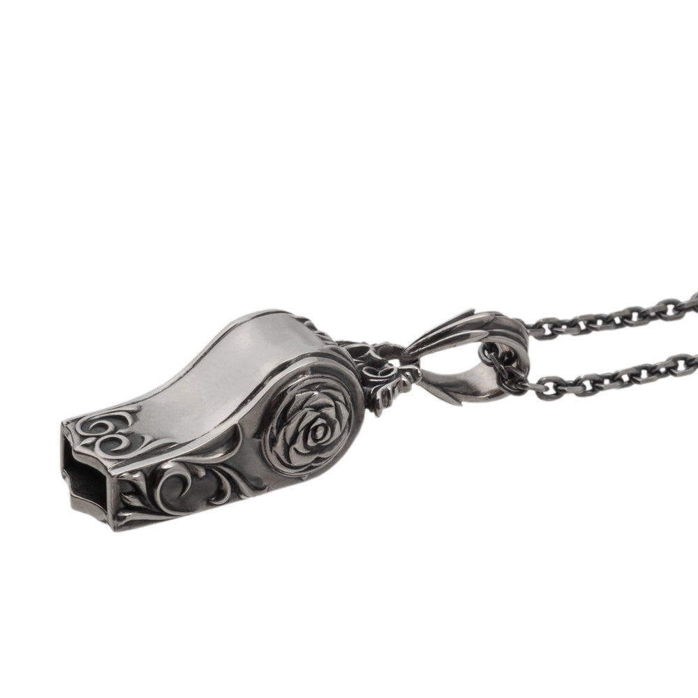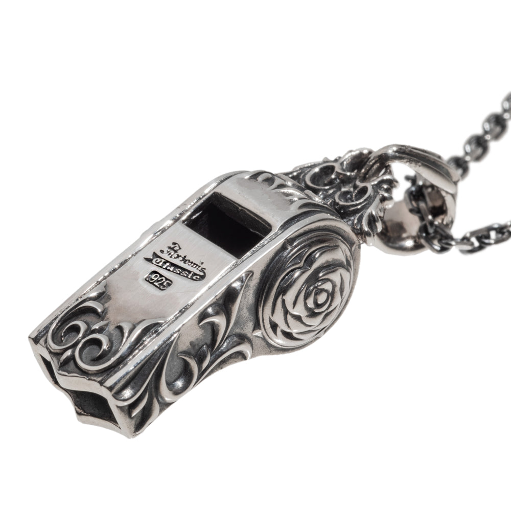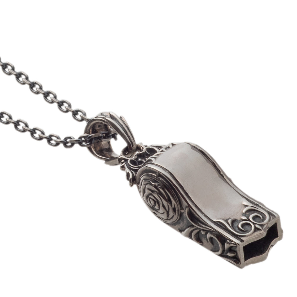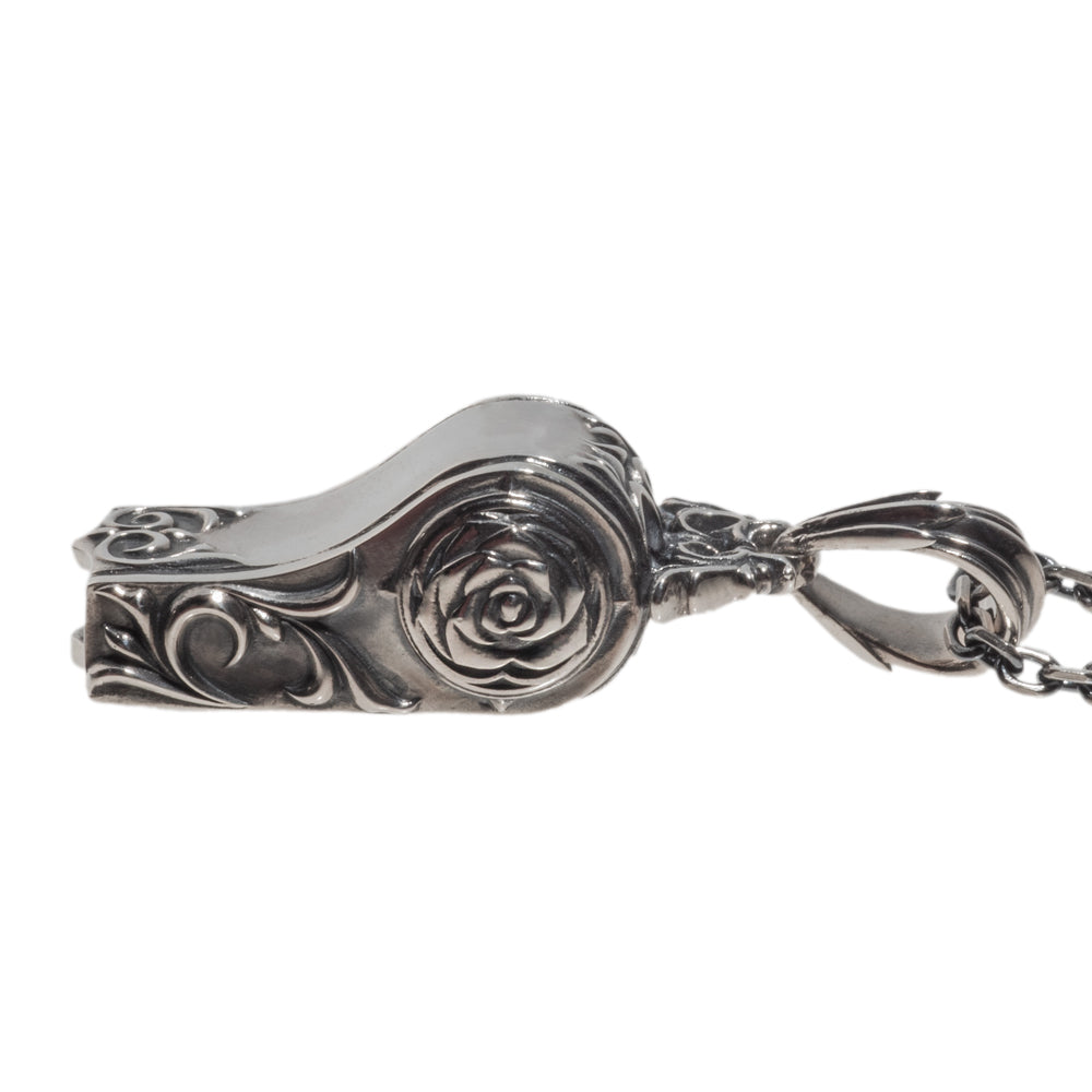 ■大人気のホイッスルペンダントのミニサイズバージョン。 ホイッスルをアルテミスらしくデザインした実用的銀製ペンダント。 息を吹き込むと実際に音が鳴る仕様で、護身用としてや防災にも使える優れモノ。 重厚で高級感のある造形に、繊細な彫り込みデザイン。 美しくバランスの良いシルエットで、本体上部の唐草の彫り込みも秀逸。薔薇シリーズを合わせてコーディネートもおススメ。 裏にはブランドと925の品質刻印。