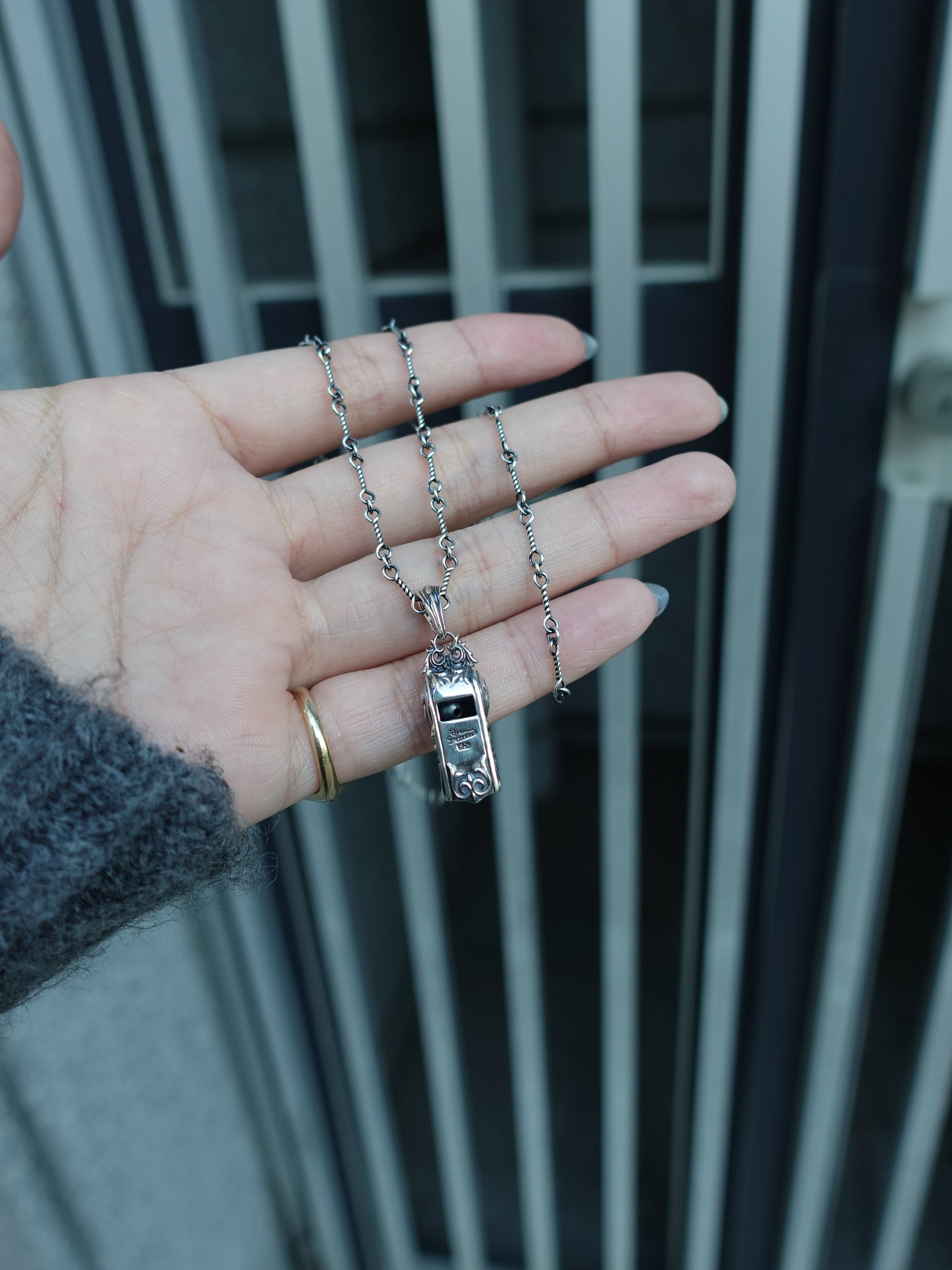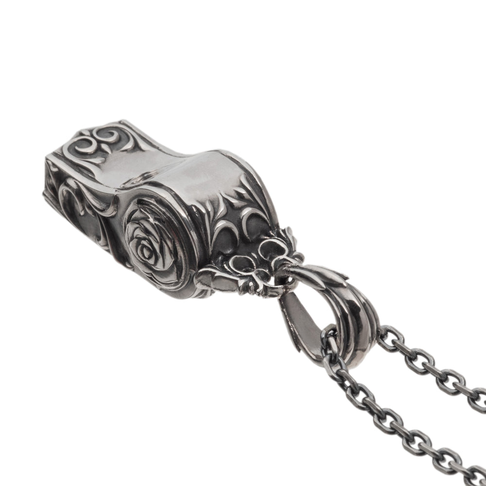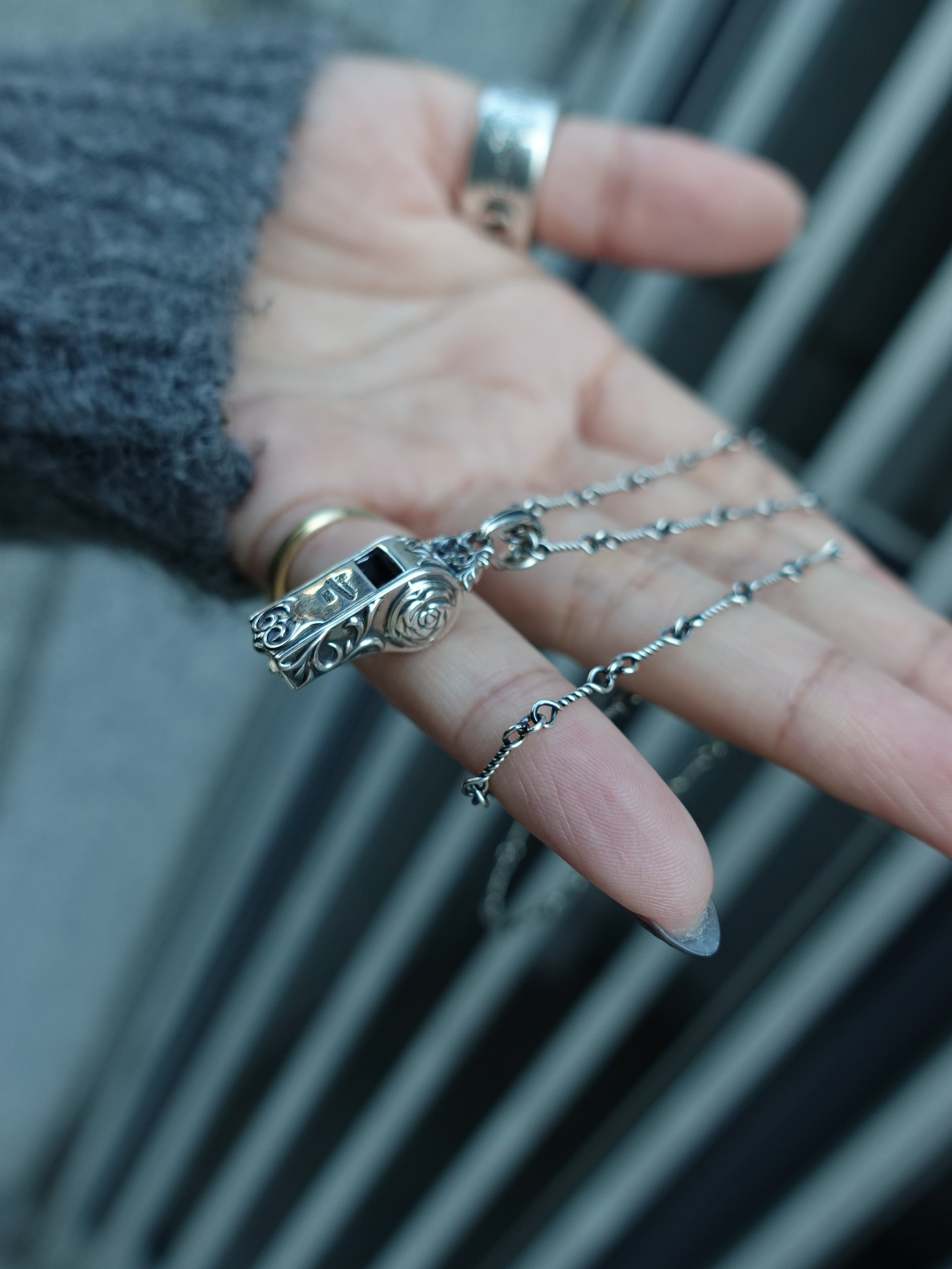 ■大人気のホイッスルペンダントのミニサイズバージョン。 ホイッスルをアルテミスらしくデザインした実用的銀製ペンダント。 息を吹き込むと実際に音が鳴る仕様で、護身用としてや防災にも使える優れモノ。 重厚で高級感のある造形に、繊細な彫り込みデザイン。 美しくバランスの良いシルエットで、本体上部の唐草の彫り込みも秀逸。薔薇シリーズを合わせてコーディネートもおススメ。 裏にはブランドと925の品質刻印。