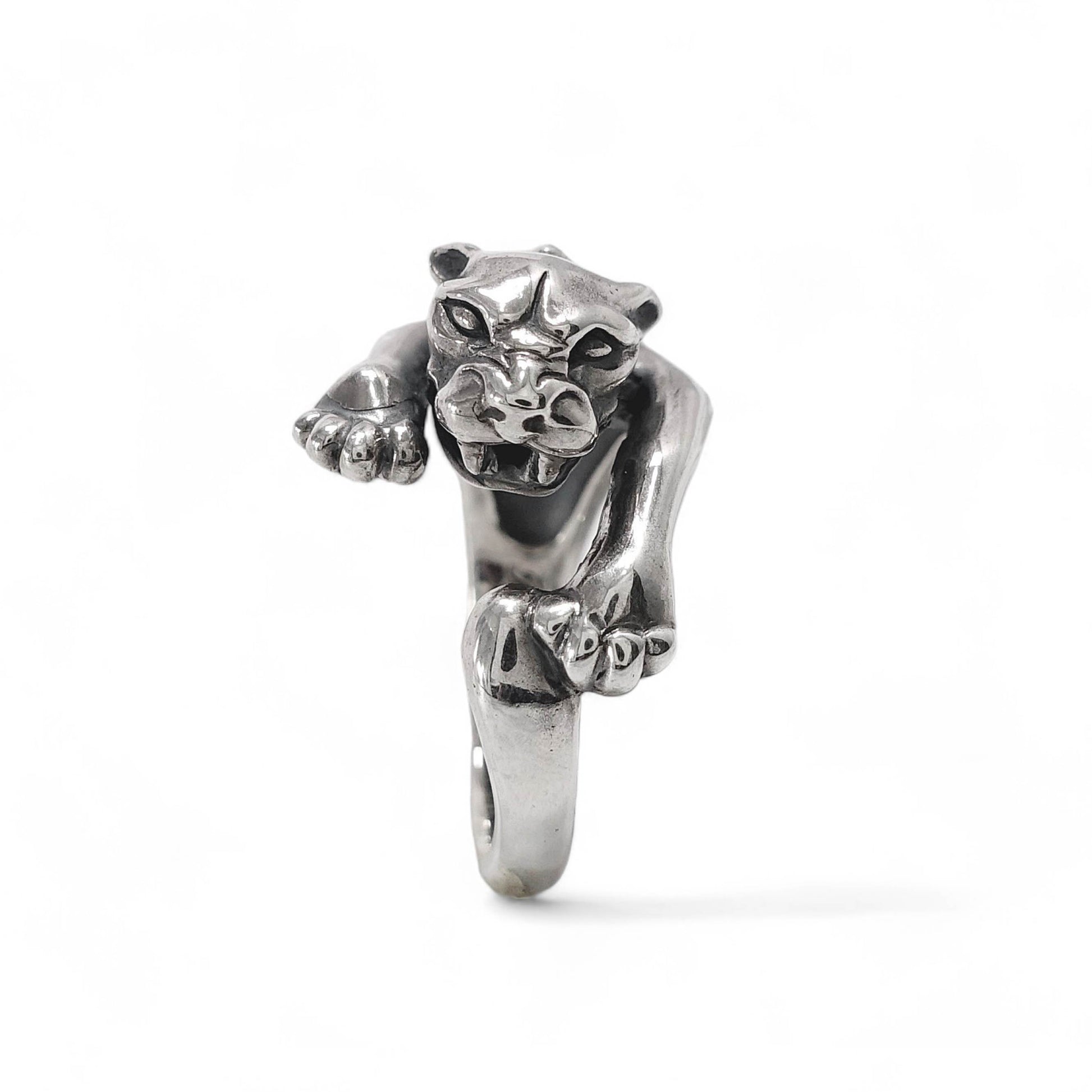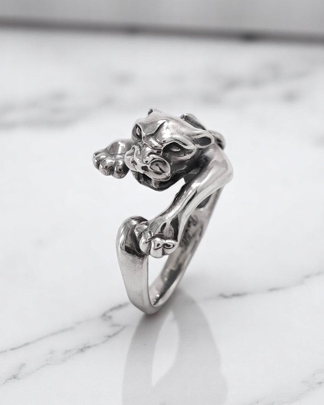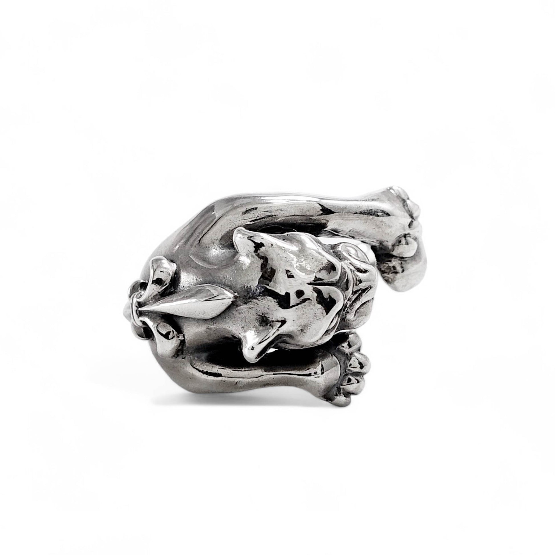 獲物を狙うかのような迫力ある造形で、指にしなやかに巻き付くその姿は、まさに野性とエレガンスが融合されたデザインです。 力強い前脚と鋭い眼差しが、内に秘めた意志と自信を表現しています。 一見ワイルドながら、パンサーの背にはフランス王家を象徴するユリの紋章が刻まれ、バスティーユらしいゴシックな気品を添えています。 ユニセックスなデザインで、ファッションのアクセントとしても圧倒的な存在感を放ちます。