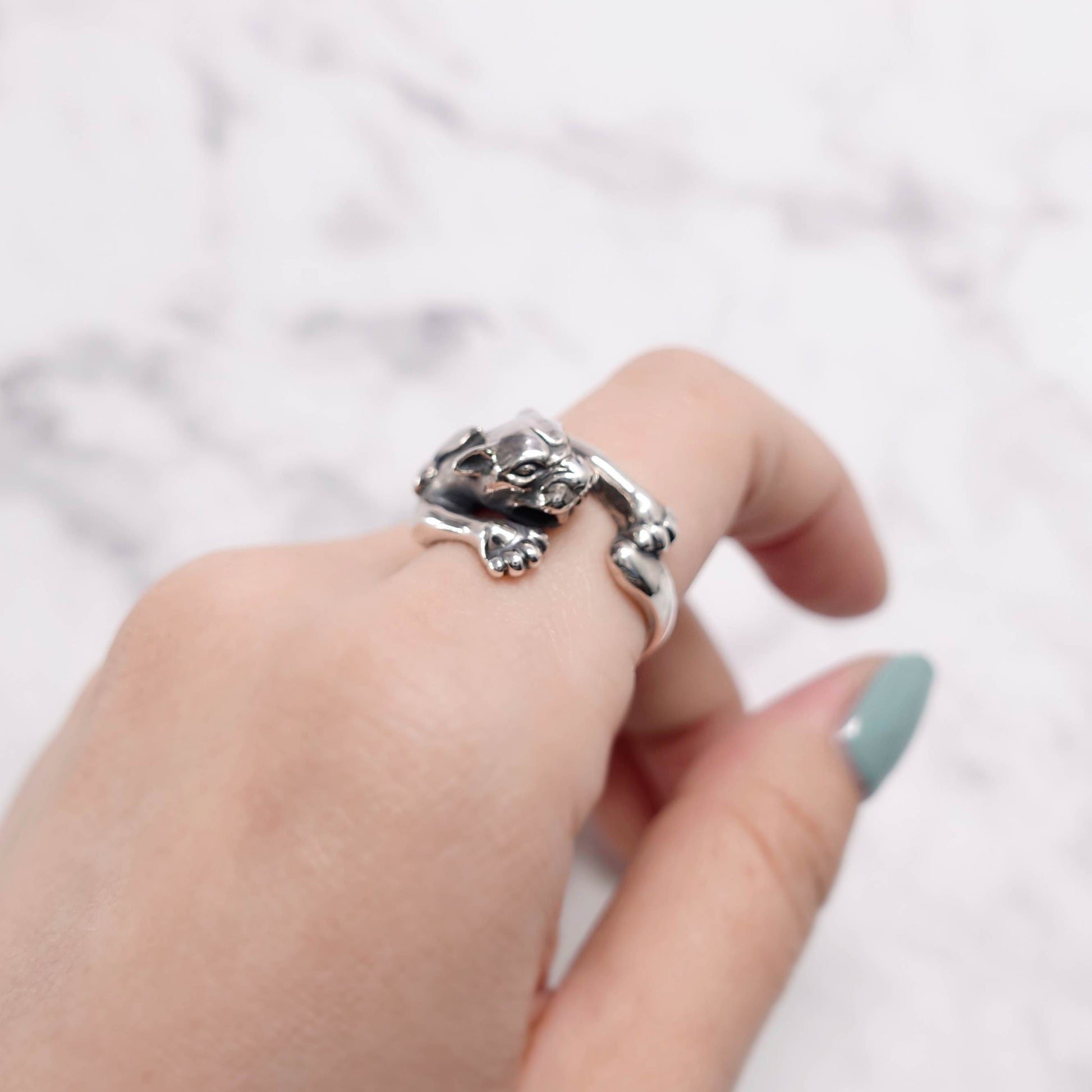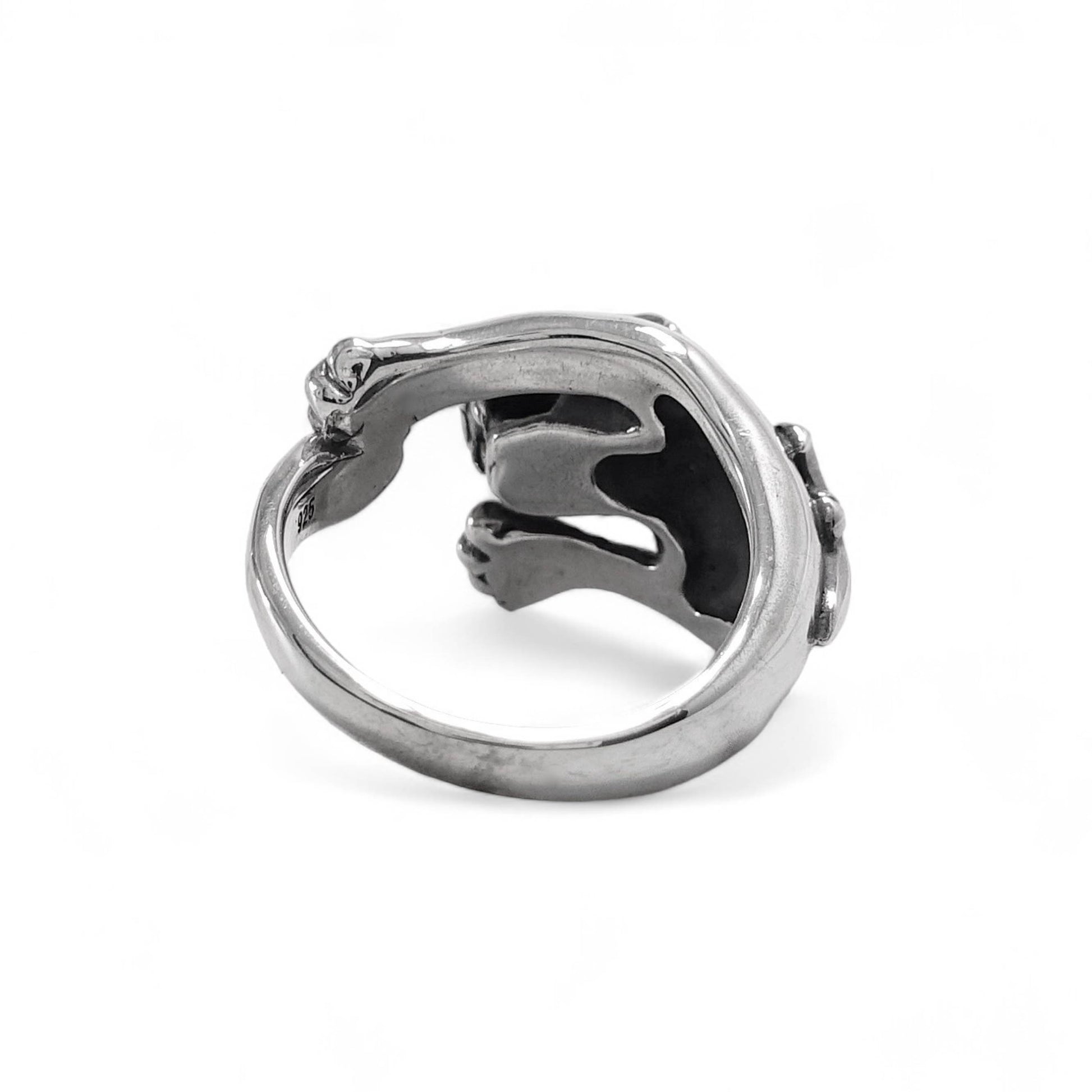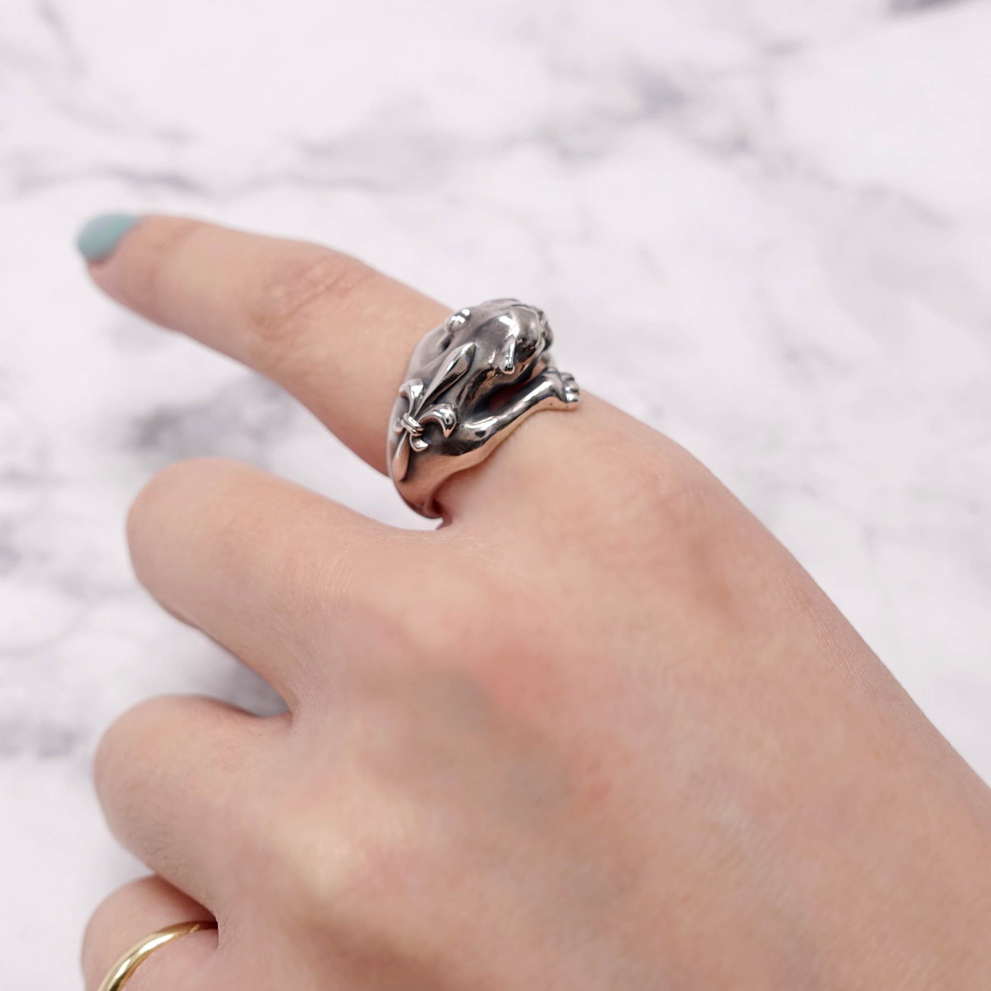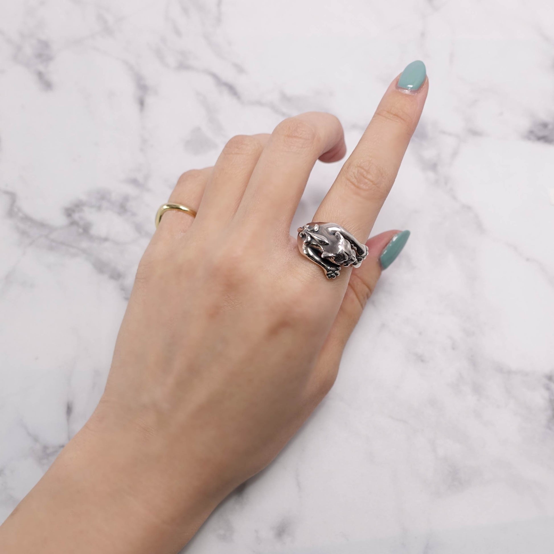 獲物を狙うかのような迫力ある造形で、指にしなやかに巻き付くその姿は、まさに野性とエレガンスが融合されたデザインです。 力強い前脚と鋭い眼差しが、内に秘めた意志と自信を表現しています。 一見ワイルドながら、パンサーの背にはフランス王家を象徴するユリの紋章が刻まれ、バスティーユらしいゴシックな気品を添えています。 ユニセックスなデザインで、ファッションのアクセントとしても圧倒的な存在感を放ちます。
