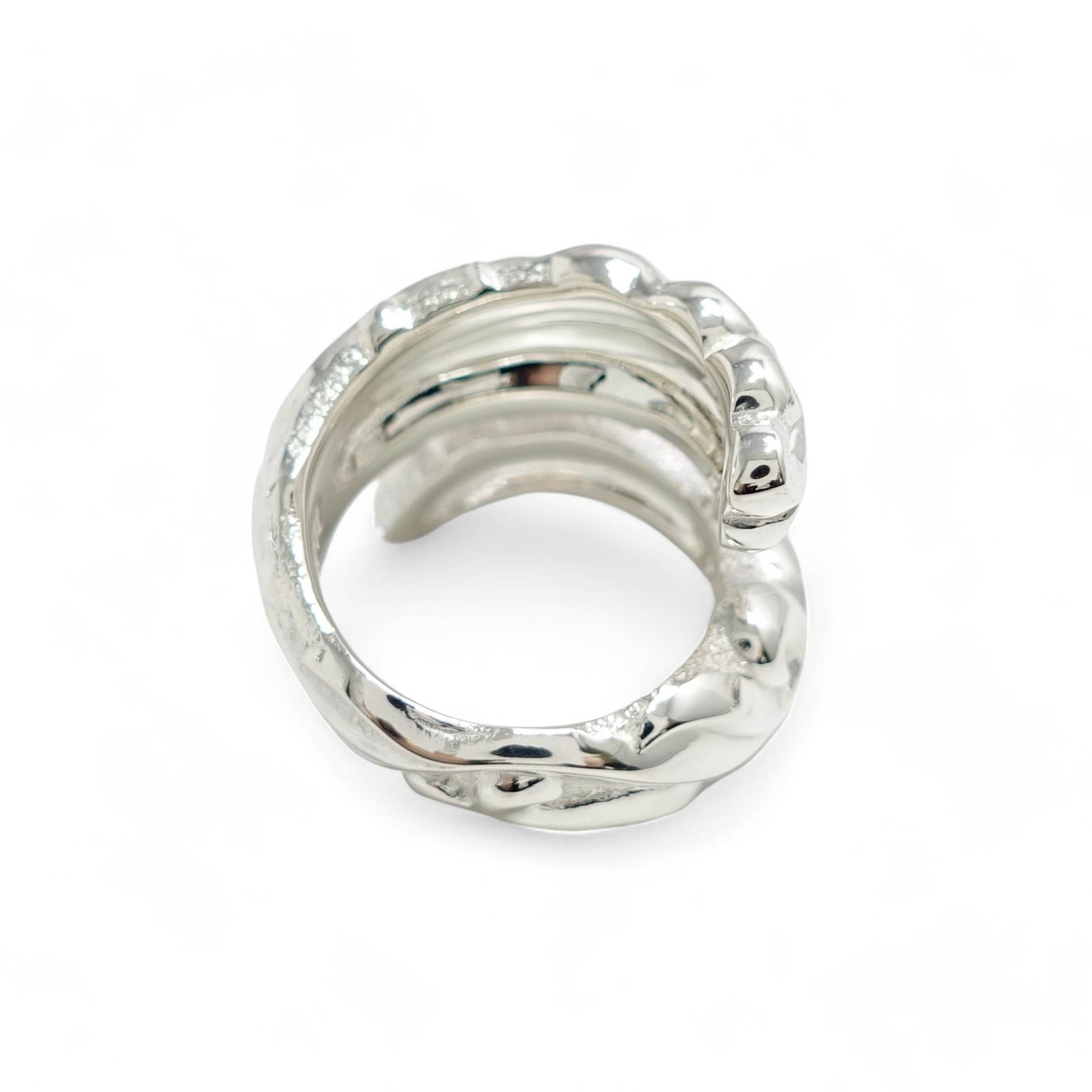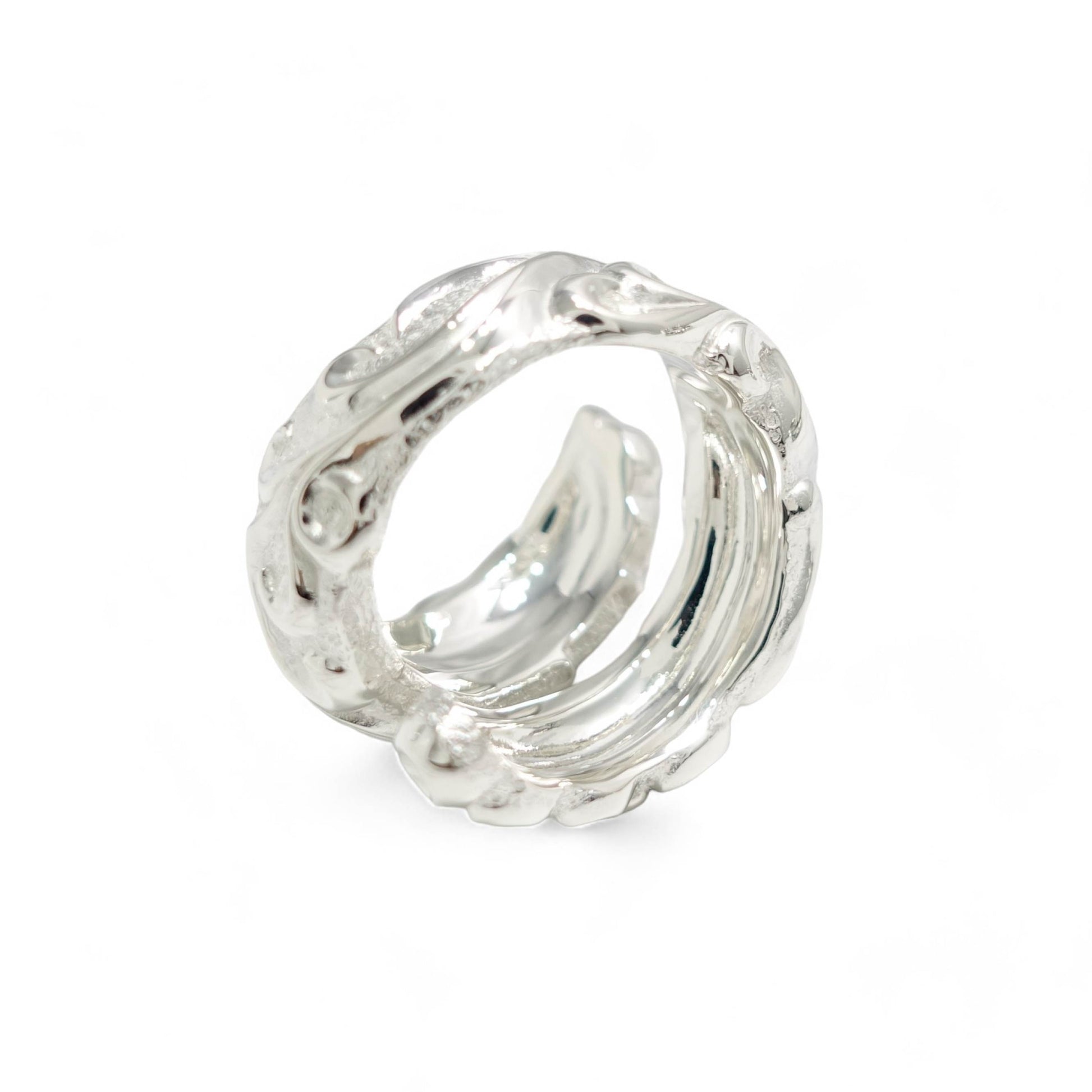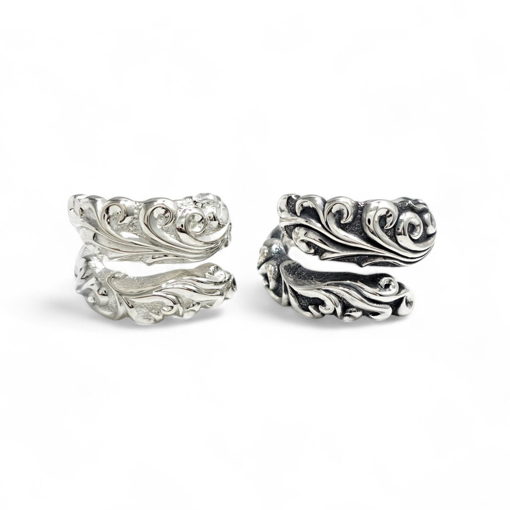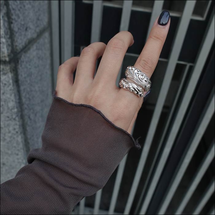 - 繊細な唐草模様が大胆に施された、存在感あふれるシルバーリング。 古くから「永遠」や「繁栄」の象徴とされる唐草を、ボリュームと立体感で表現した一本です。 指に巻き付くようなダイナミックなフォルムは、アートピースのような美しさを持ちながらも、どこか温かみのある表情に。 性別を問わずお楽しみいただける逸品です。