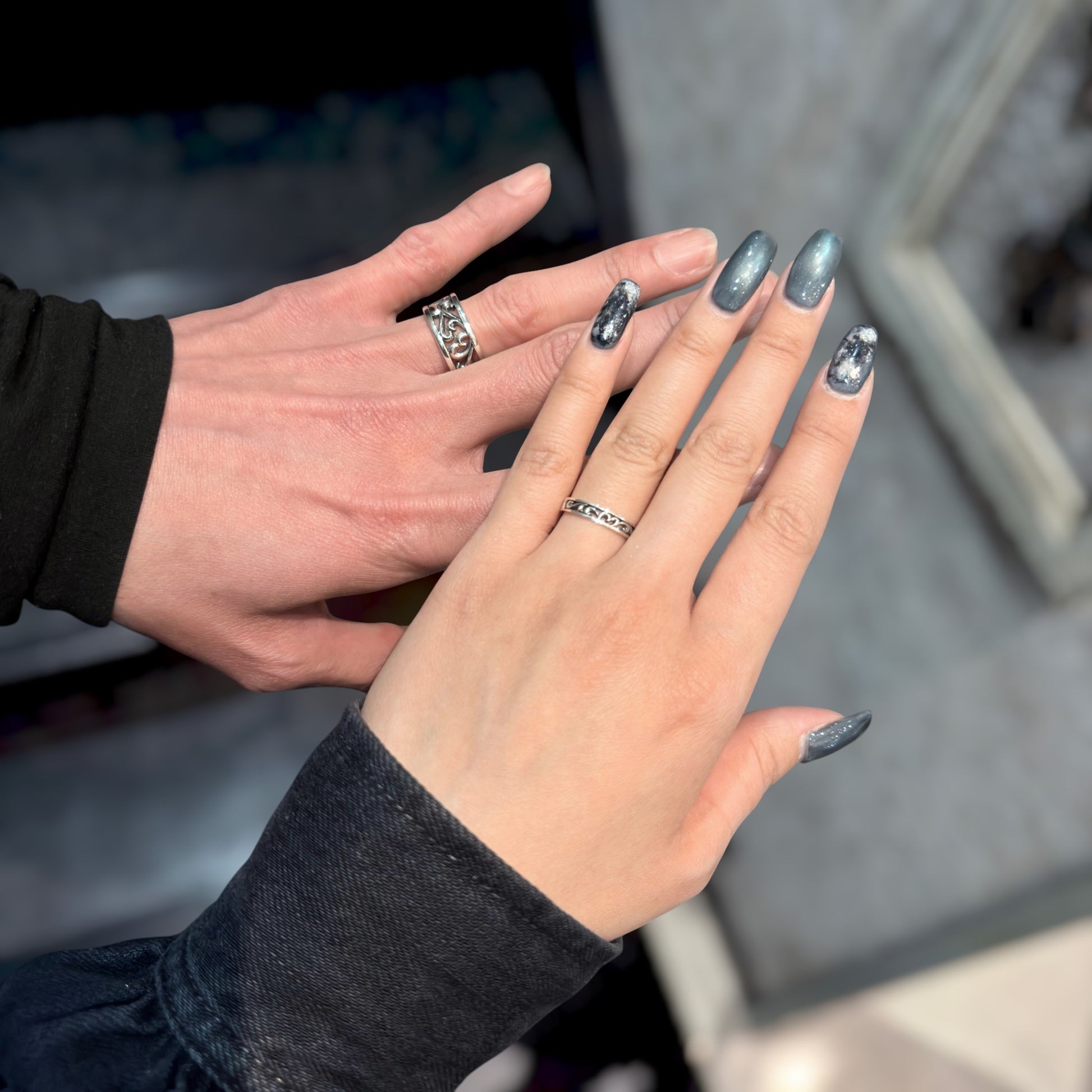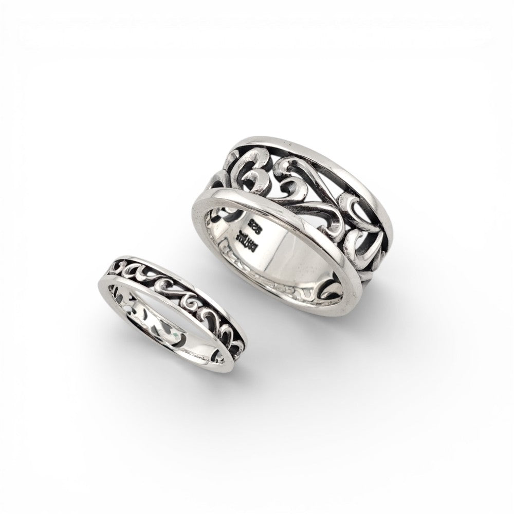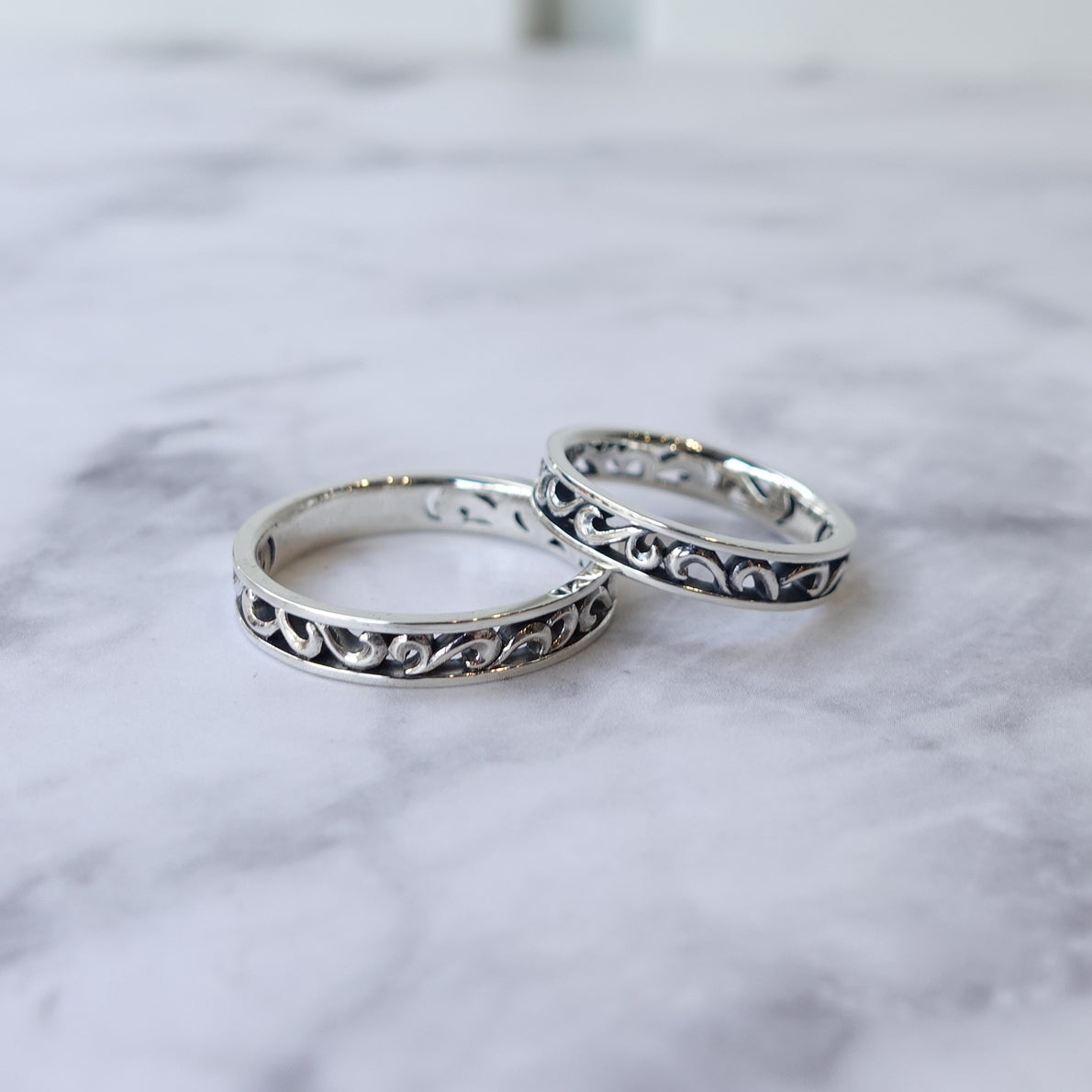 リング全体に施された透かし彫りの唐草模様は、立体感のある山形フォルムで表現されており、光を受けるたびに美しい陰影を生み出します。 丁寧な手仕事から生まれる精巧なディテールは、日本製の誇る高品質を物語ります。 内側はなめらかに仕上げられており、引っかかりの少ないスムーズな作りで、日常使いにもストレスなくご使用いただけます。 また、幅広いサイズ展開も魅力のひとつ。 こちらの「アンバーパロールリング スモール」と、存在感のある太めの「アンバーパロールリング」は、ペアリングとしても相性抜群。 性別を問わず、自然体でお揃いを楽しめるデザインです。