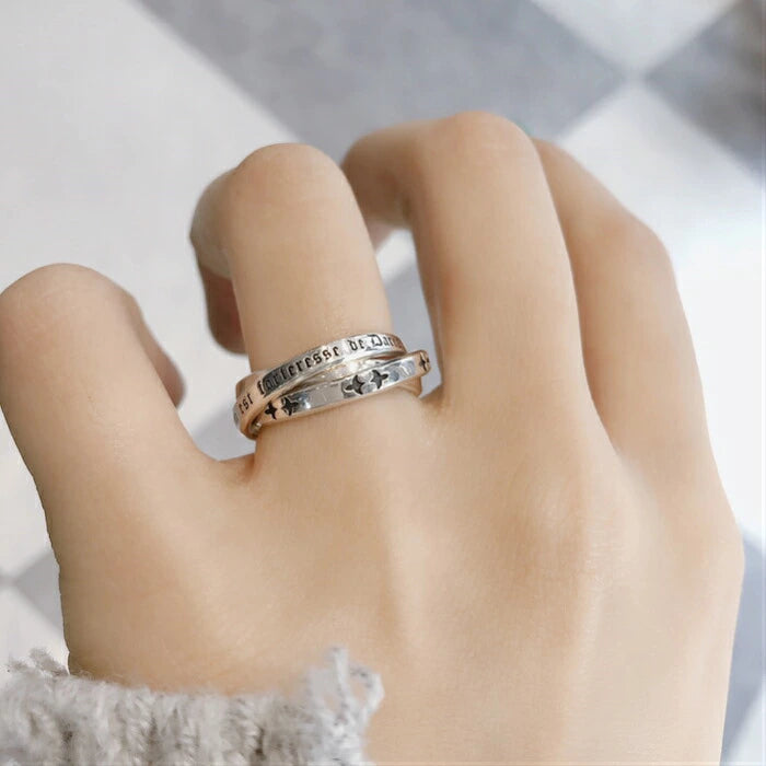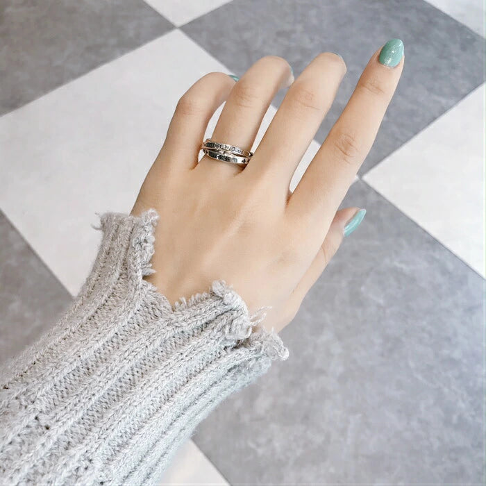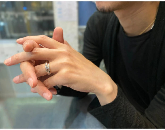 プレーン、文字彫刻、ユリのモチーフと、それぞれ異なる表情をもつリングが重なり合い、シンプルながら奥行きのある存在感を放ちます。