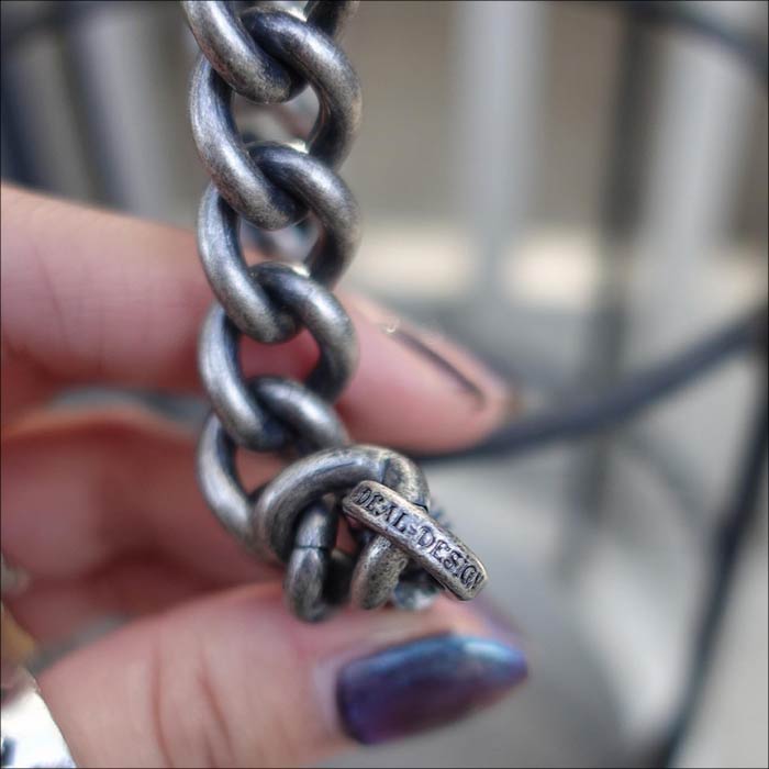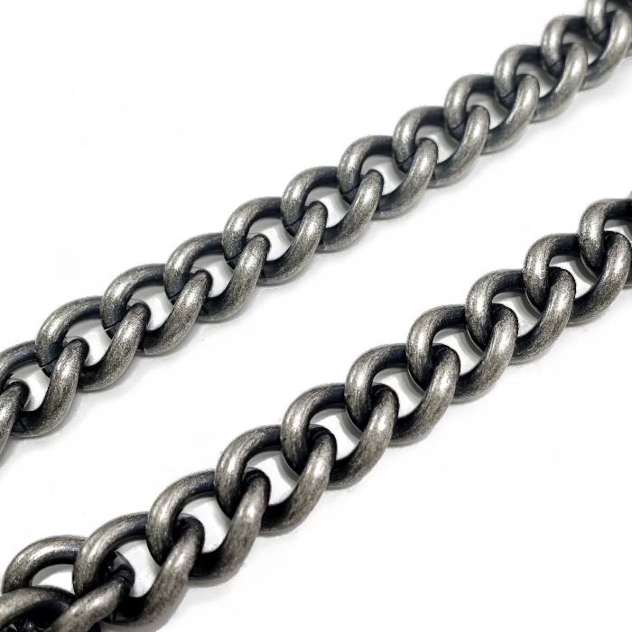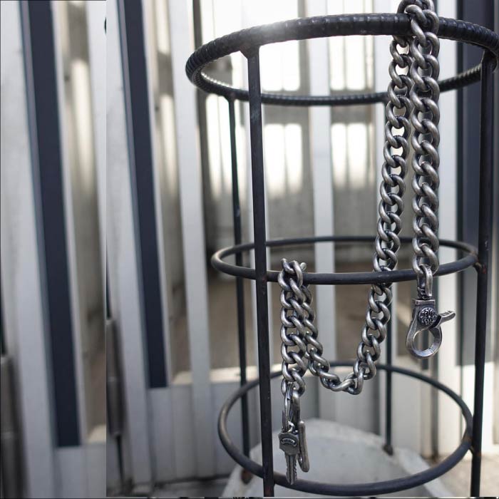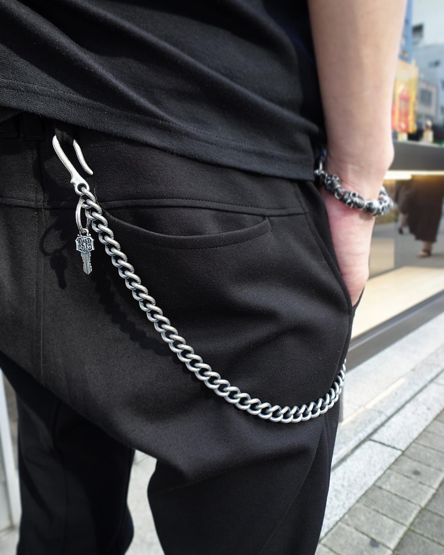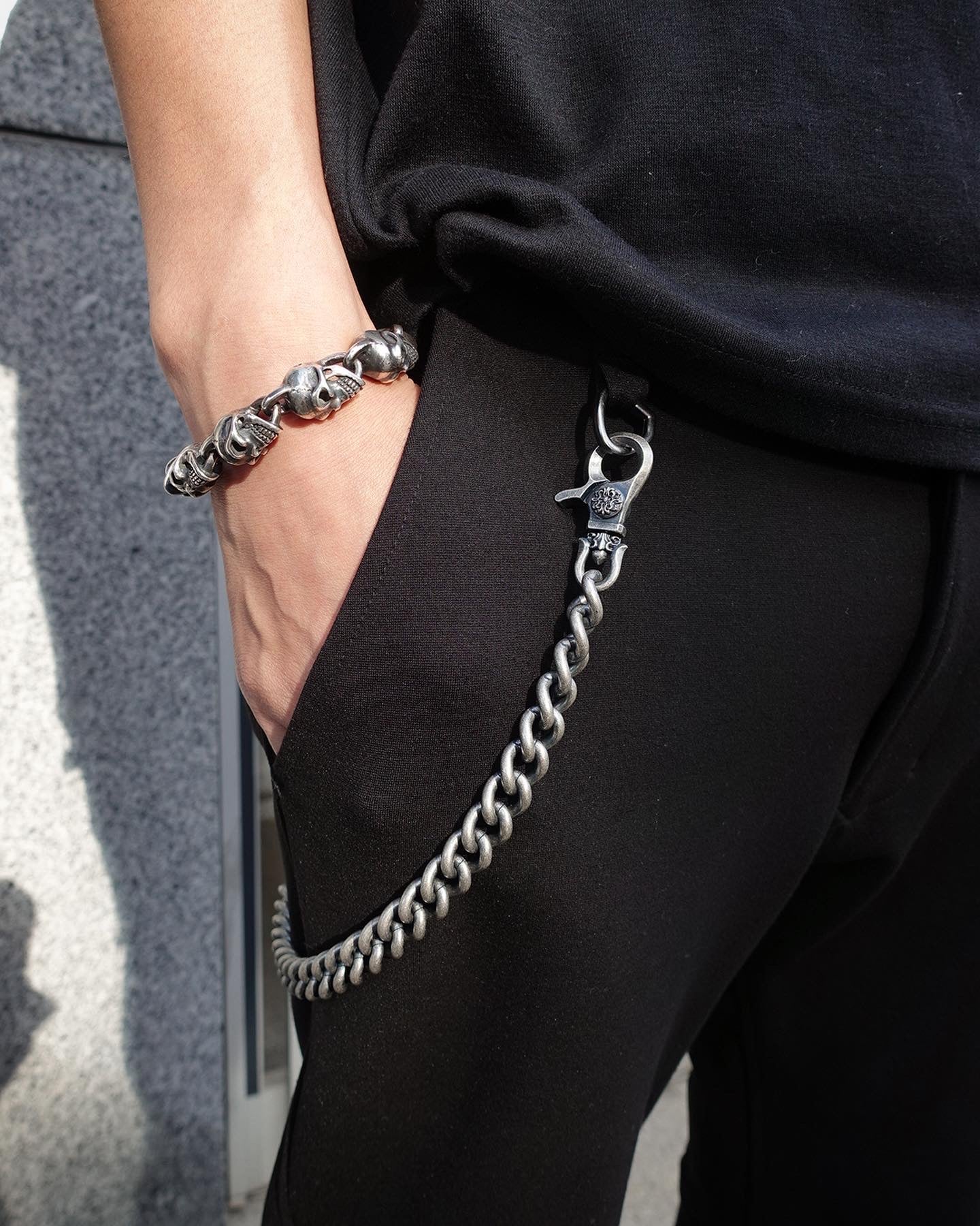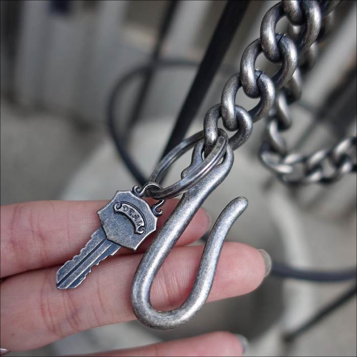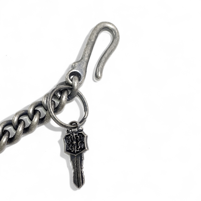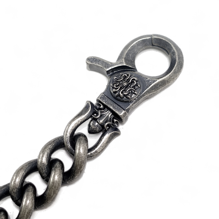 - キングゲートを施したクリップが際立つ真鍮製のウォレットチェーン。 銀古美加工を施すことで長年使い込んできたような風合いに仕上がっている。