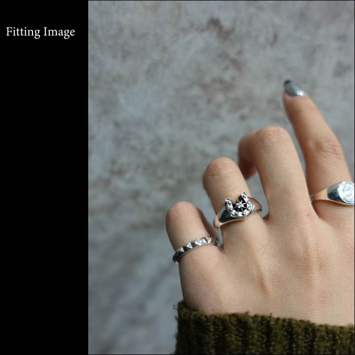 - ■ストーンをセットしたホースシューを配したきれいめなリング。 両サイドにはあえてデザインを施さず、シンプルな面のみで構成しているため中心のデザインがより引き立つ仕上がり。