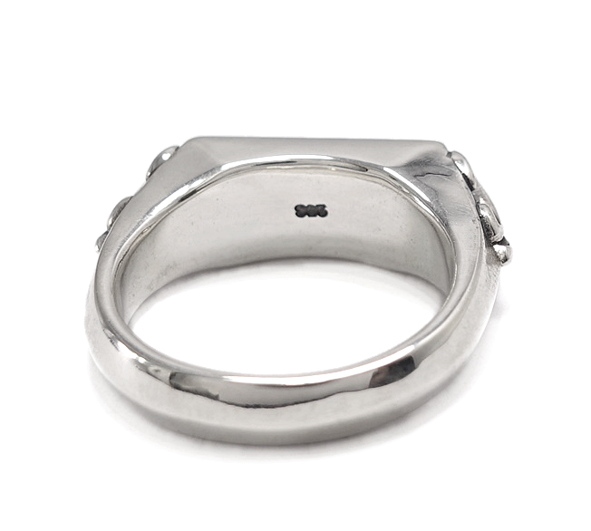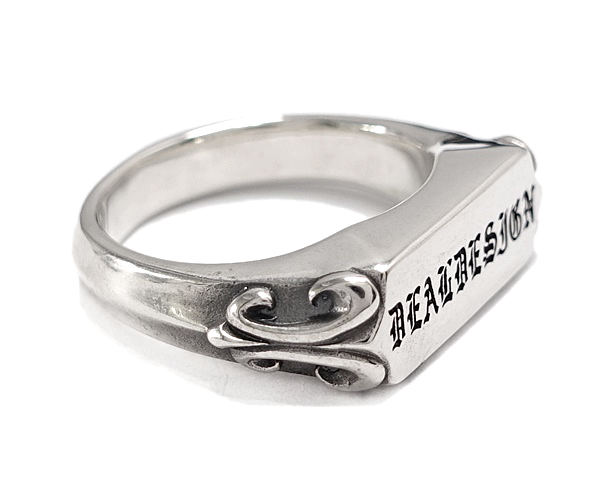- ■淡い鏡面にブランドネームを刻んだバータイプのシグネットリング。 両面に彫られたリリーの彫刻が、中世ヨーロッパを感じさせる雰囲気を醸し出す。