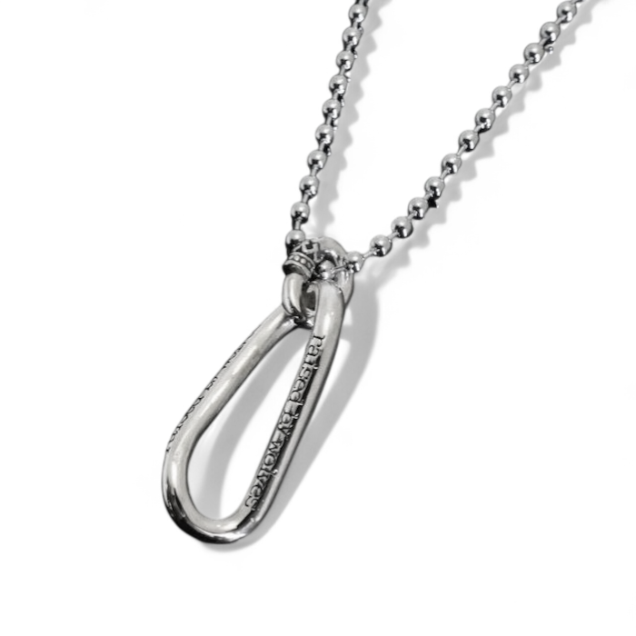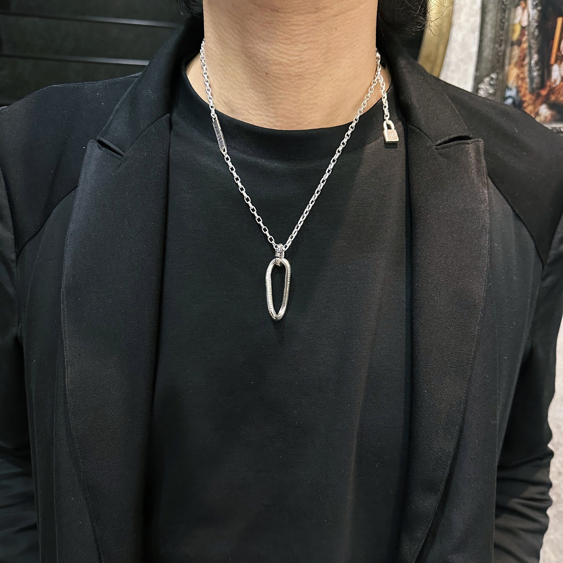 FRAGMENT(断片)に込められたストーリー GODSIZE® FIGARO FRAGMENT pendant ゴッドサイズ® フィガロチェーンの持つ曲線美を、FRAGMENT(断片)として強調したペンダント。バチカンに独創的なデザインのクラウンモチーフをあしらうことで生まれたこのアイテムは、単なるアクセサリーを超えた、物語を語りかけるような魅力を持っています。 独立した一コマは、まるで一つの完成されたアートピースのよう。シンプルでありながらも、その美しい曲線は見る者の心を捉えます。 それは、誰にも媚びず、自身の道を歩むあなたの強さ、そして内に秘めた美しさを象徴するかのよう。 身につけることで、自身のストーリーを静かに語り始めます。 こちらは、ひとまわり大きなLサイズ。