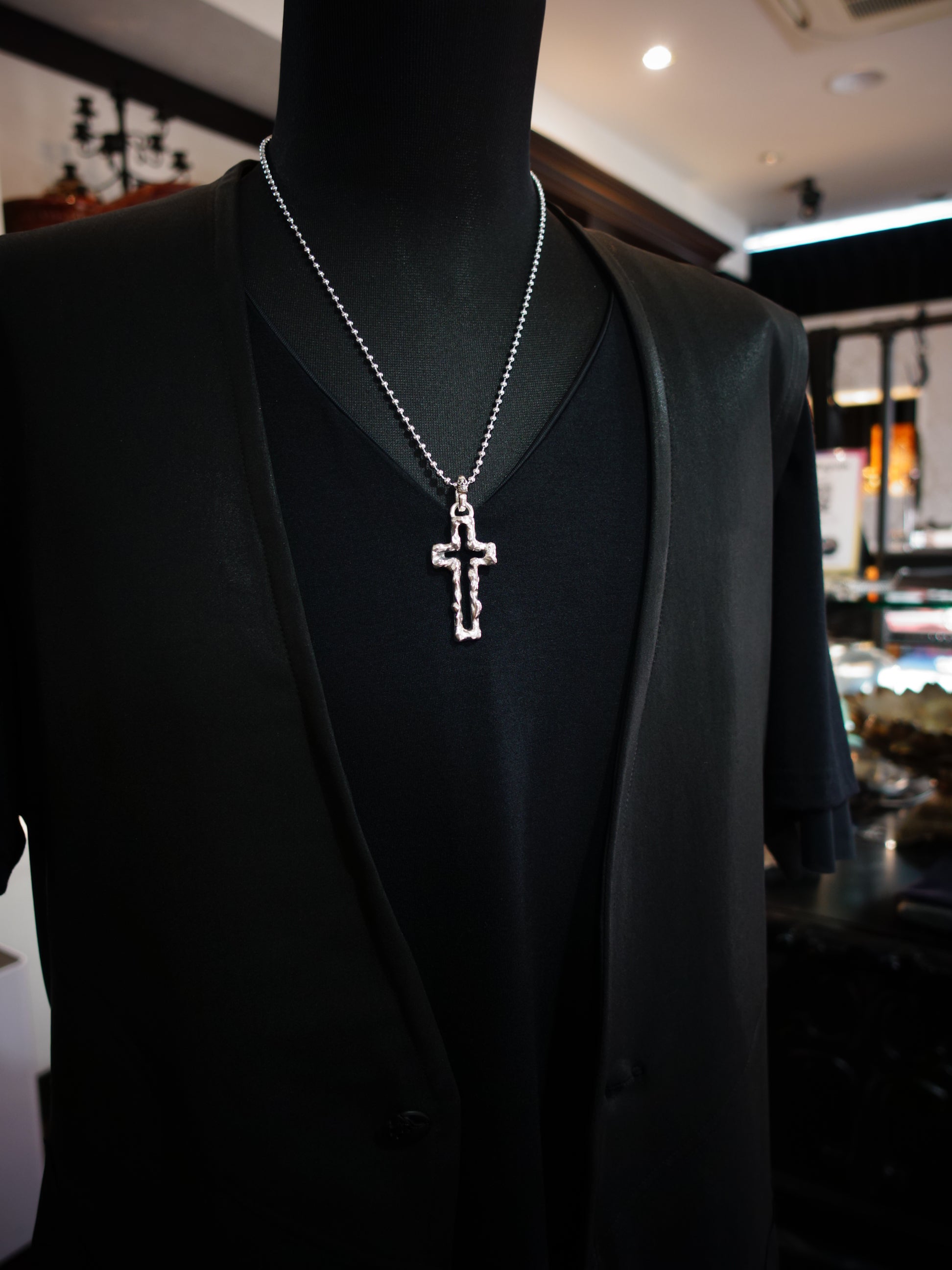 - ■都会の教会の扉にインスピレーションをうけて誕生した "オープン"クロス。 やわらかな曲線と直線が渾然一体となったアウトラインに、いぶし加工された内側のブラックと外側のシルバーのコントラストが際立ちます。 バチカンには、1994年にラインナップに加えられて以降、多くの方々に支持されてきたクラウンのモチーフ。 ポップなデザインながらも、どこか厳かな雰囲気も感じられるネックレスです。