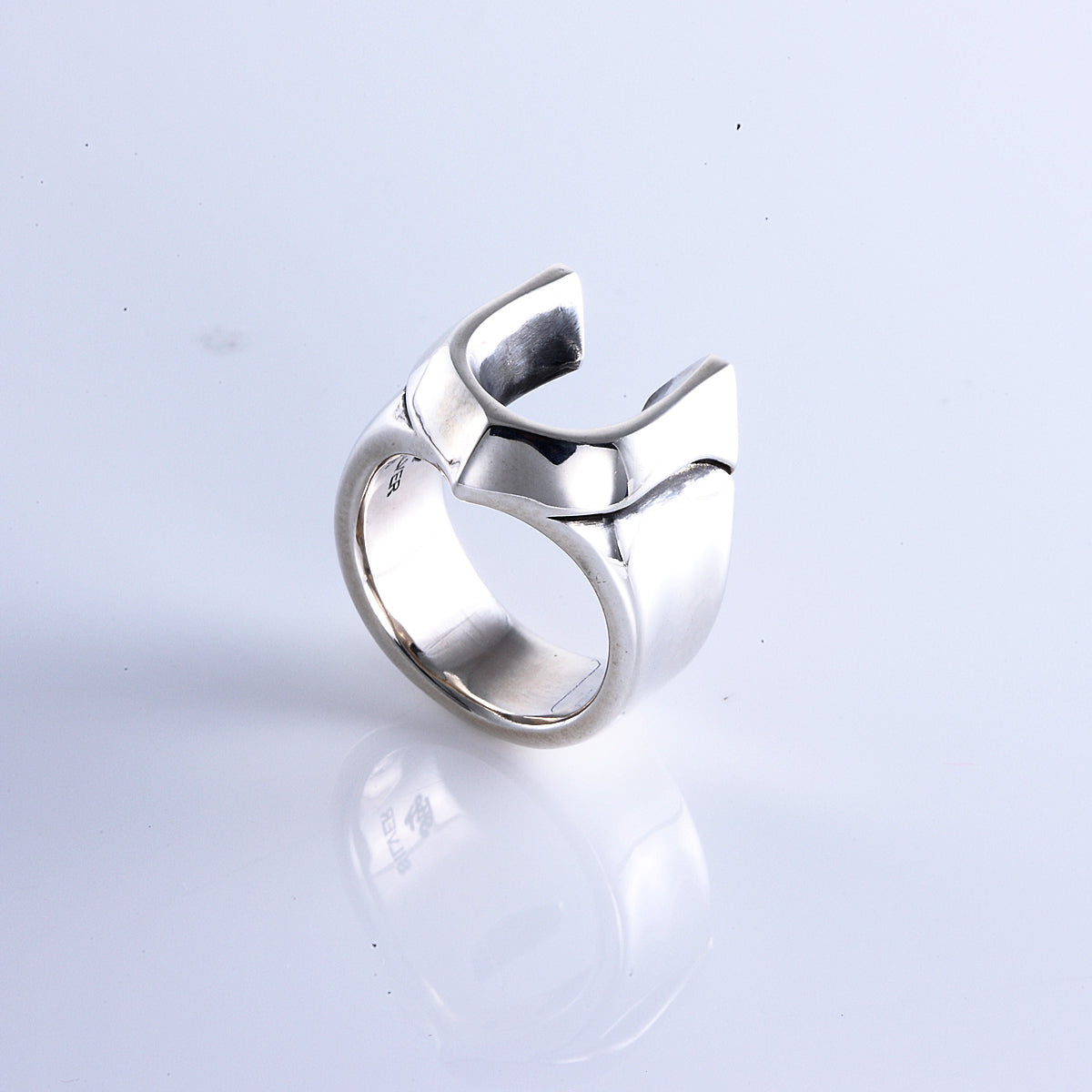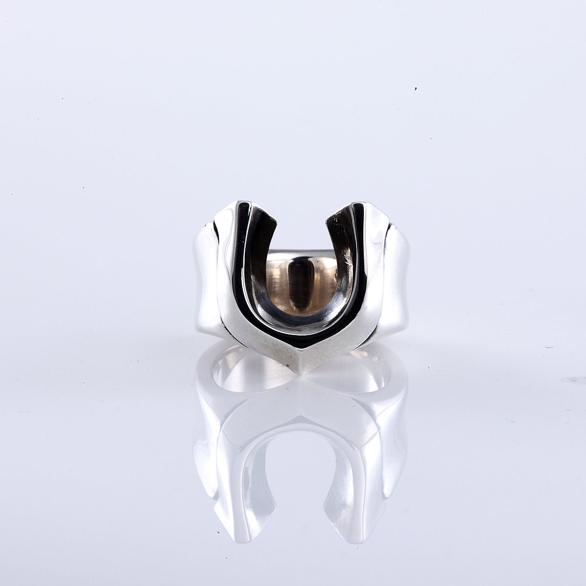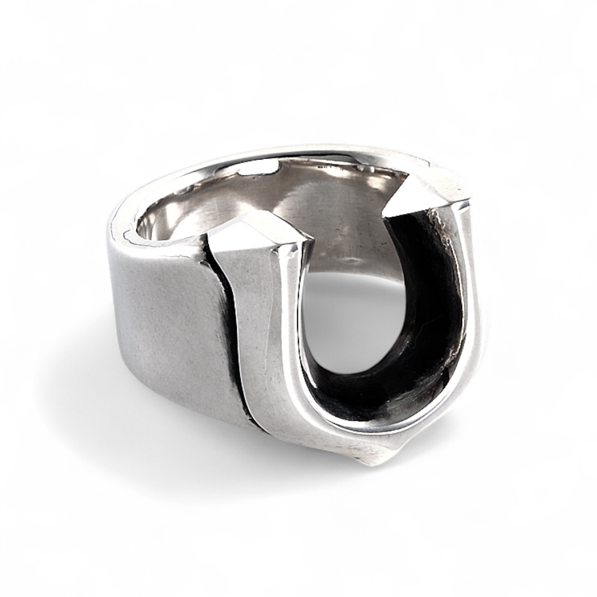 ■こちらは、幸運を呼び寄せるとされるホースシュー(馬の蹄)をモチーフにしたリングです。 「ハイ・ローラー」とは“大金を賭ける人”を意味し、ラスベガスでは彼ら専用のVIPルームが存在します。スラングでは“金にも女にも不自由しない色男”を指し、クレイジーでクールなその意味合いは、まさにキングリモのコンセプトを象徴しています。 美しいフォルムとバランスの取れたボリューム感は存在感があり、ペアリングとしてもご着用いただけます。