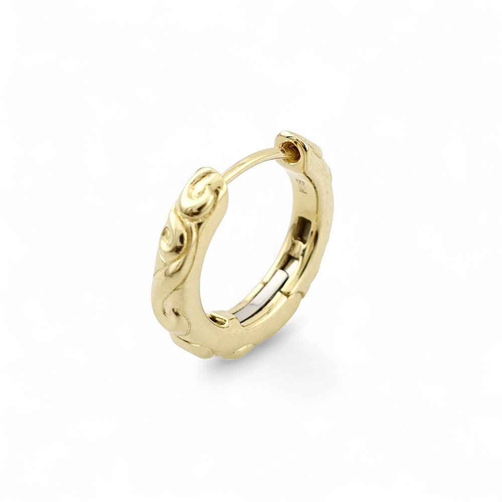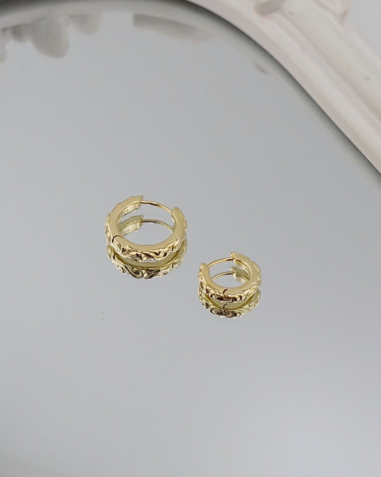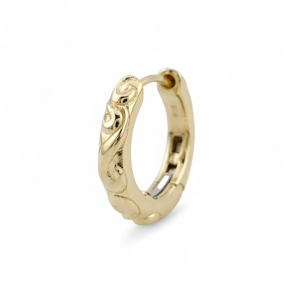 ■繊細な彫り模様が印象的な、クラシックかつモダンなフープピアス。 着脱にはバネ式構造を採用し、ポストが折れる心配がなく、スムーズに装着が可能。毎日使いたくなる快適さです。 全てK18YG(18金)を使用したワンランク上のアイテム。 サイズは2展開 ※こちらはLサイズのページです Sサイズ:外径 約11mm(さりげなく上品) Lサイズ:外径 約16mm(ほどよい存在感) デイリーユースにも、特別な日のアクセントにもおすすめの逸品。サイズ違いでの重ね着けや、ペア使いにも最適です。 ※1個販売です