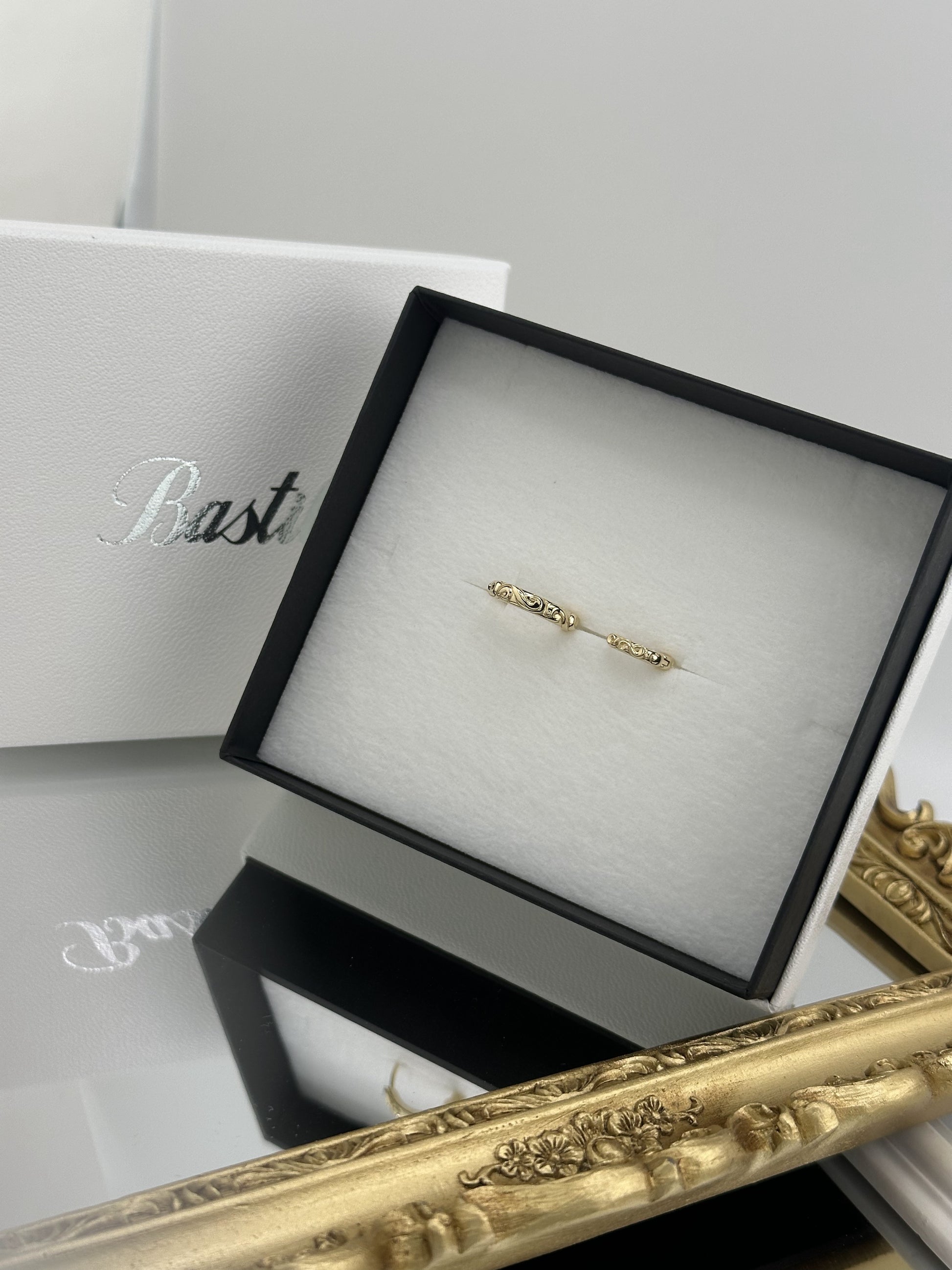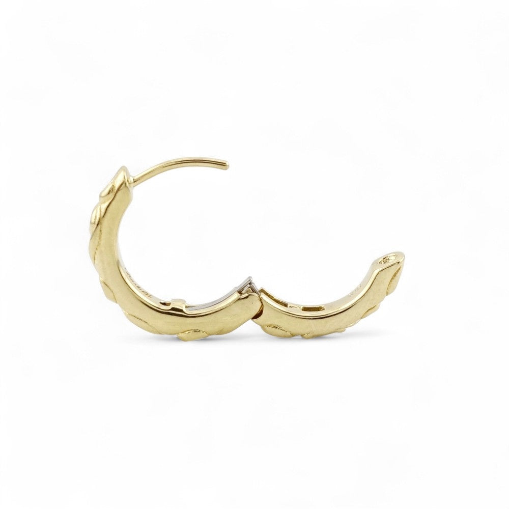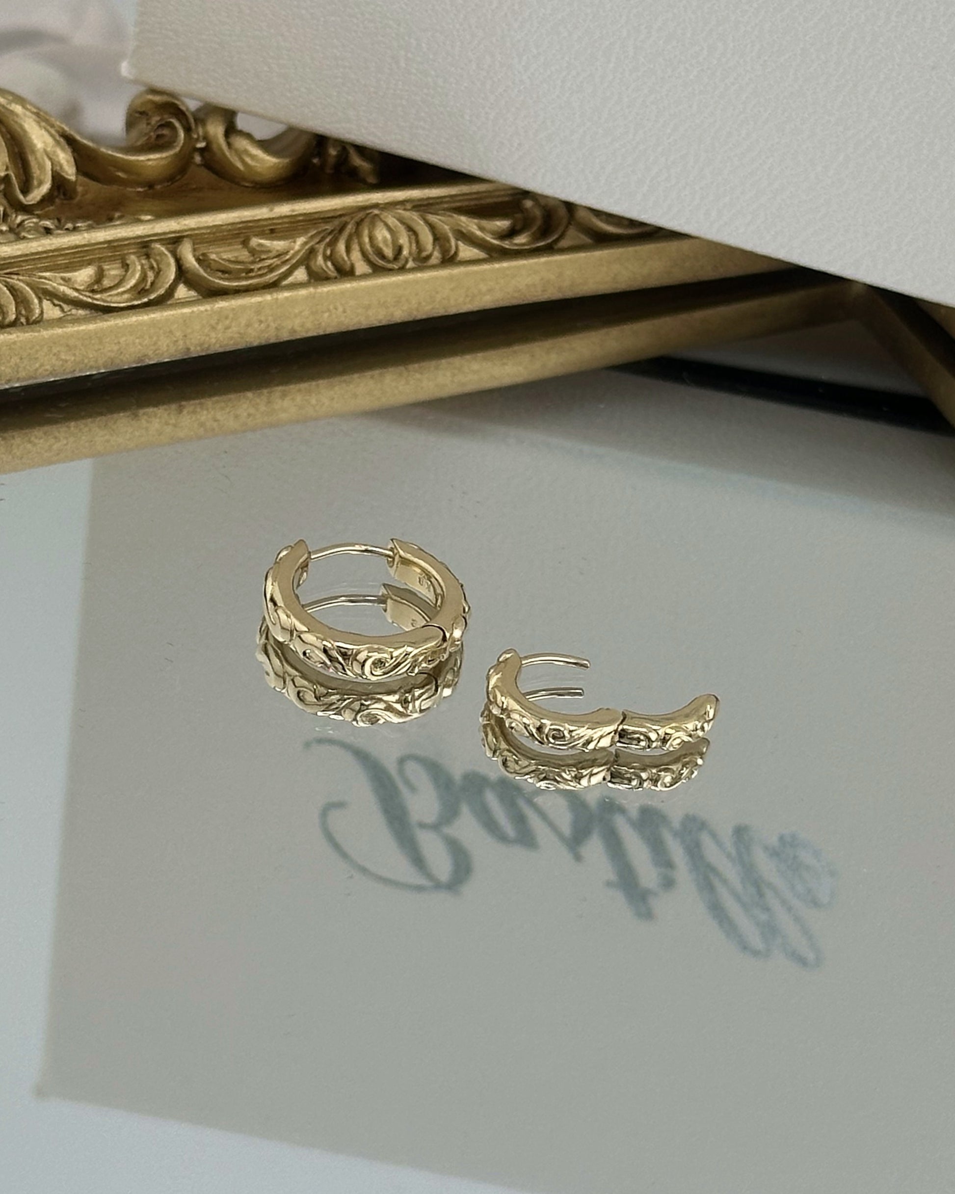 ■繊細な彫り模様が印象的な、クラシックかつモダンなフープピアス。 着脱にはバネ式構造を採用し、ポストが折れる心配がなく、スムーズに装着が可能。毎日使いたくなる快適さです。 全てK18YG(18金)を使用したワンランク上のアイテム。 サイズは2展開 ※こちらはLサイズのページです Sサイズ:外径 約11mm(さりげなく上品) Lサイズ:外径 約16mm(ほどよい存在感) デイリーユースにも、特別な日のアクセントにもおすすめの逸品。サイズ違いでの重ね着けや、ペア使いにも最適です。 ※1個販売です