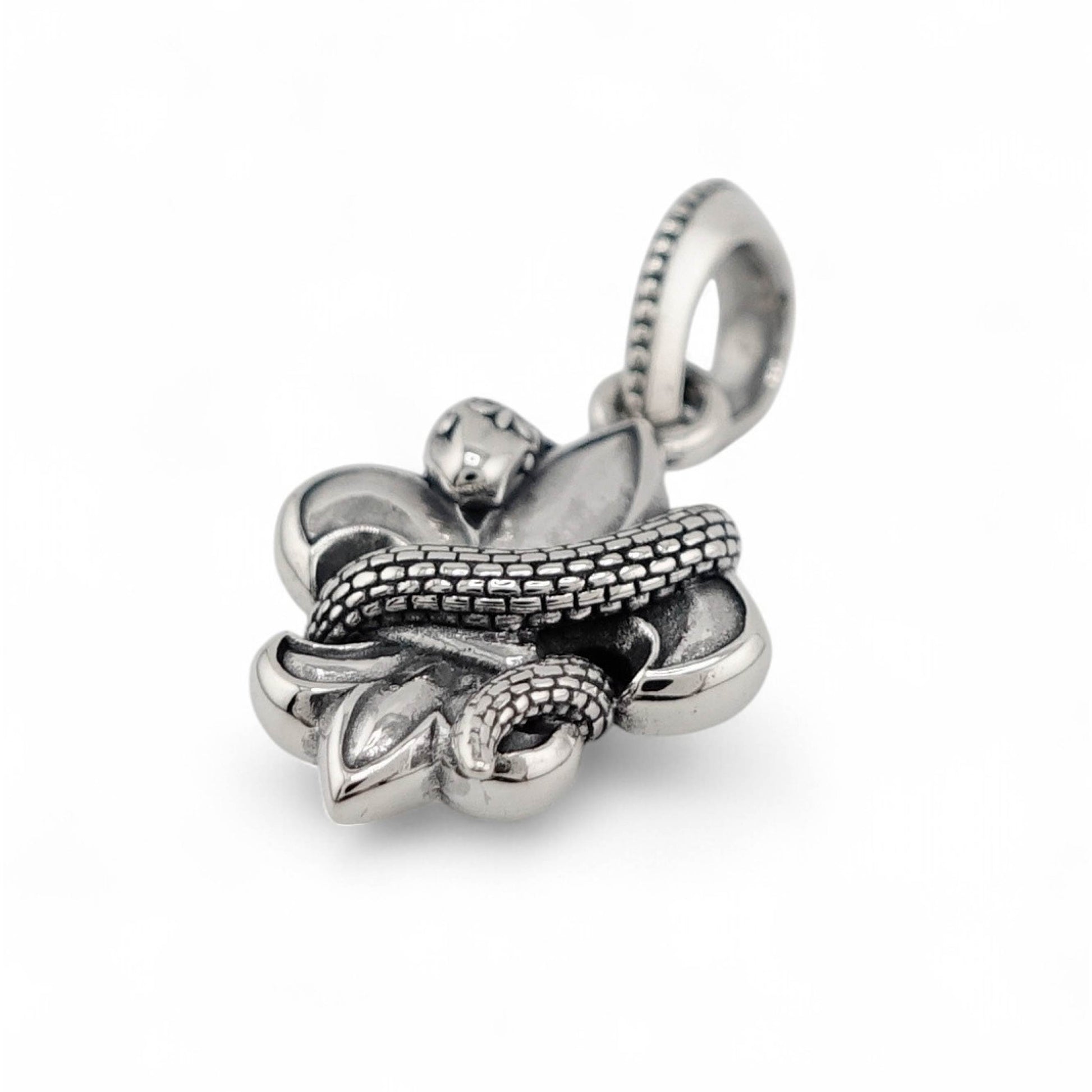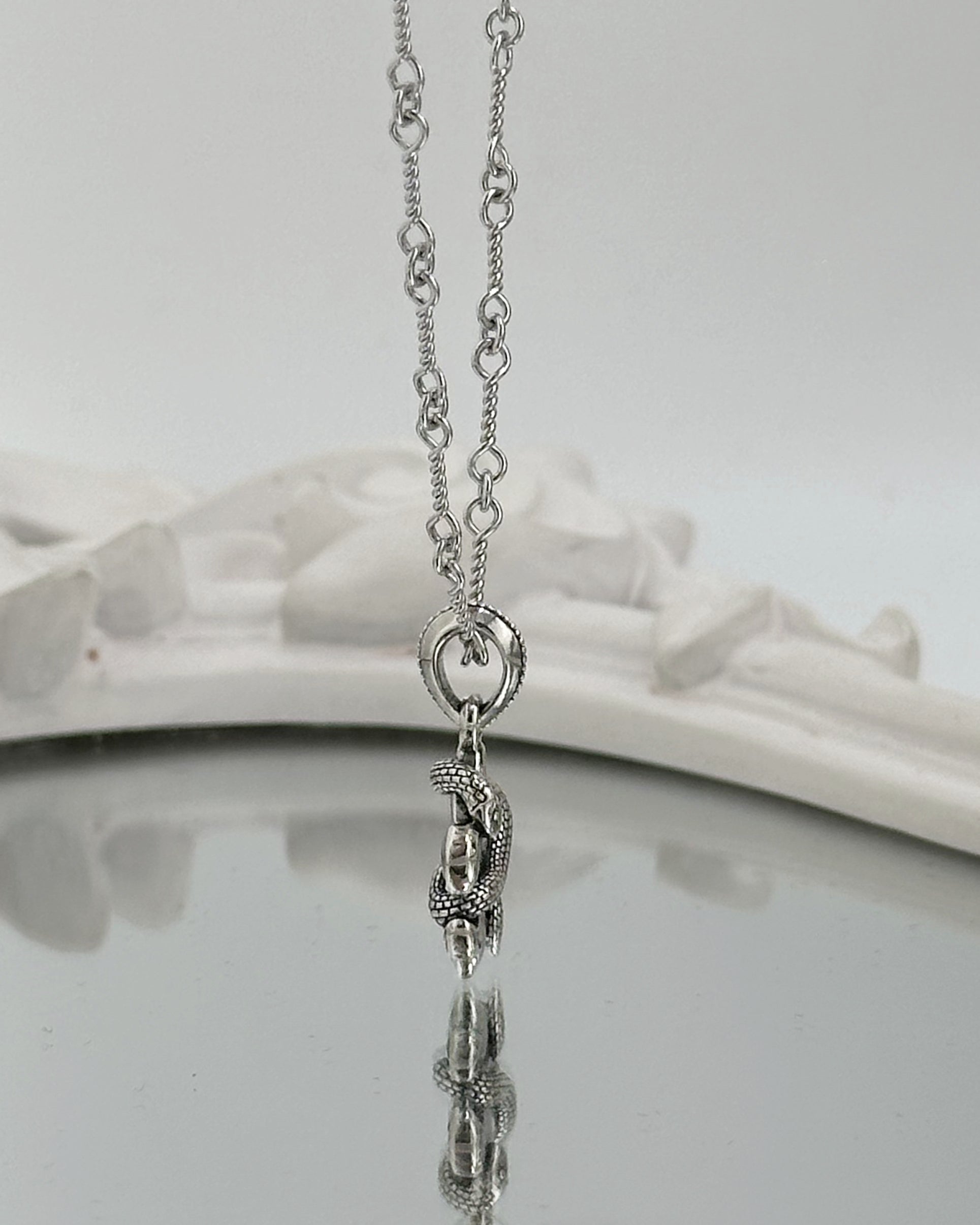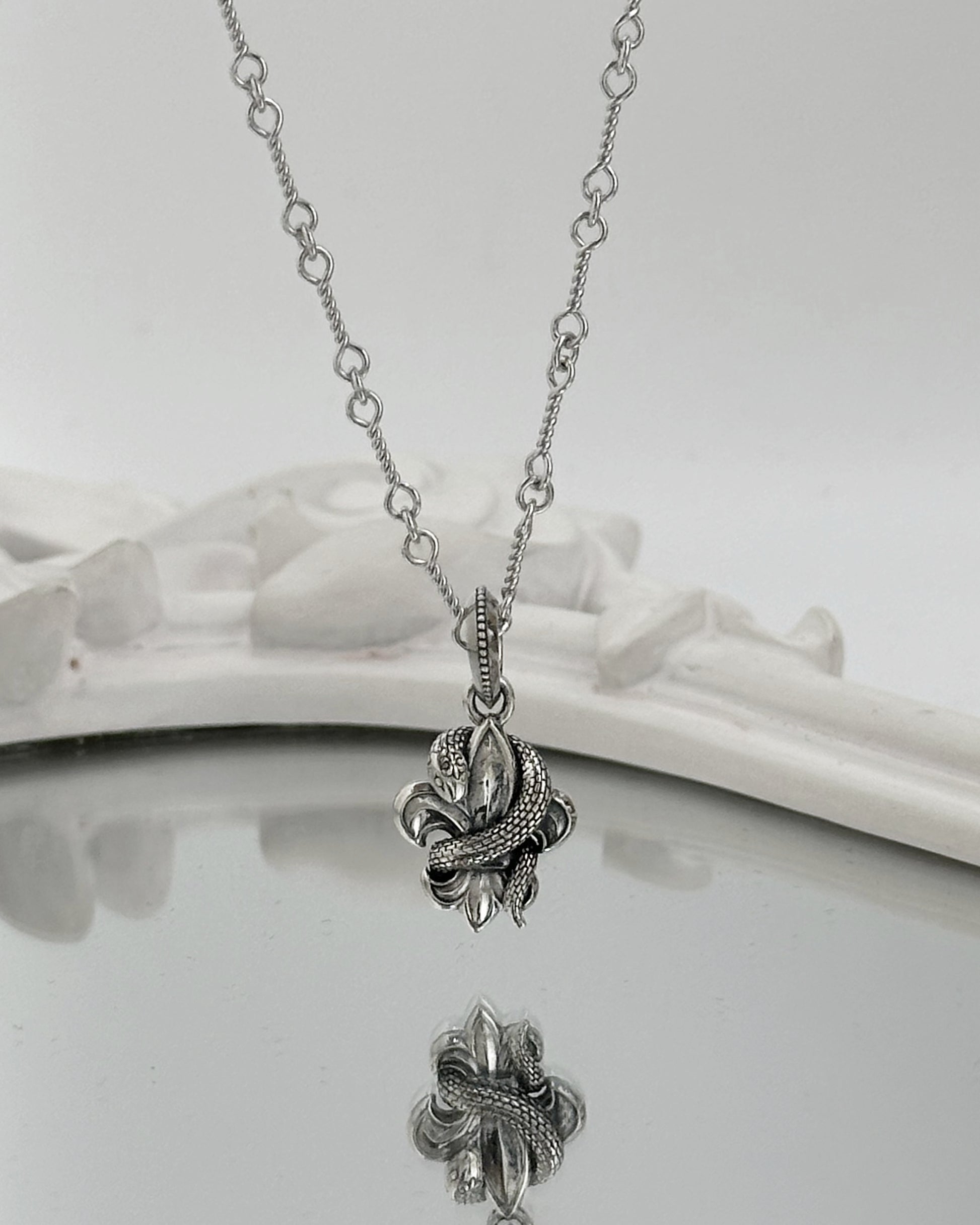 ■Néa(ネア) はフランス語の「新しく生まれた(née)」に由来し、再生・変容・目覚めを意味する名。 古来より“脱皮”を繰り返して成長する蛇は、「変化を恐れず、自らを再定義し続ける存在」の象徴です。 蛇がしなやかにユリの花を包み込むように絡みつき、力強くも静かな守護の存在感を放ちます。 その頭部には、リングと共通するユリの刻印を添え、全体のフォルムは繊細ながらも重厚なつくりで、鱗一枚一枚の立体感と滑らかな曲線が印象的。 小ぶりながらも確かな存在感を放ち、日常にも特別な日にも寄り添います。