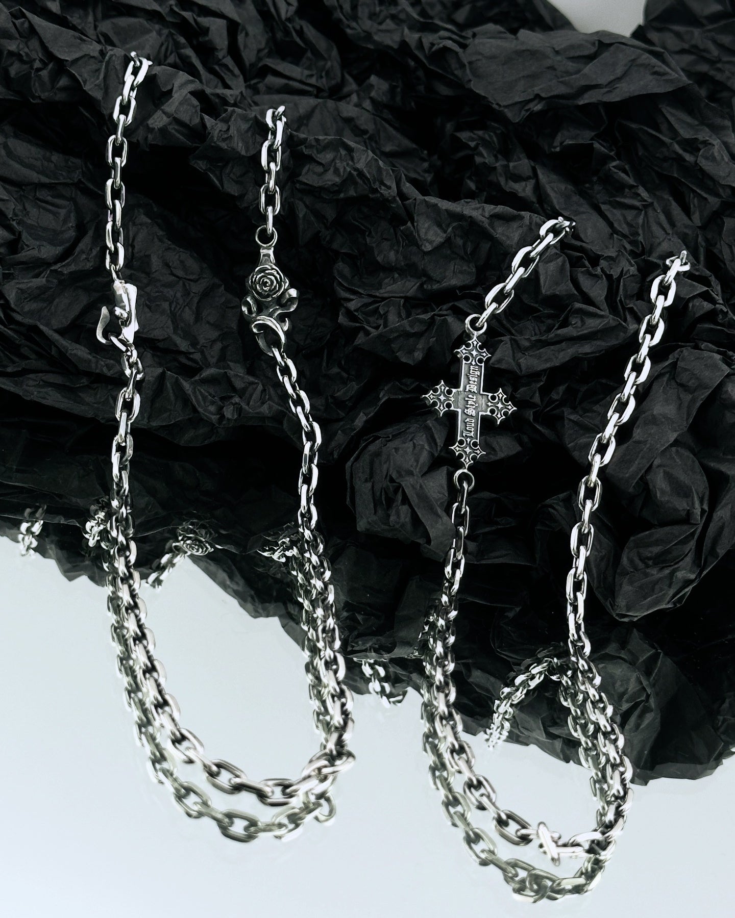 - ■UH-009の薔薇チャームを組み込み、Loud Style Design らしい重厚感と繊細さを両立させたデザインチェーン。